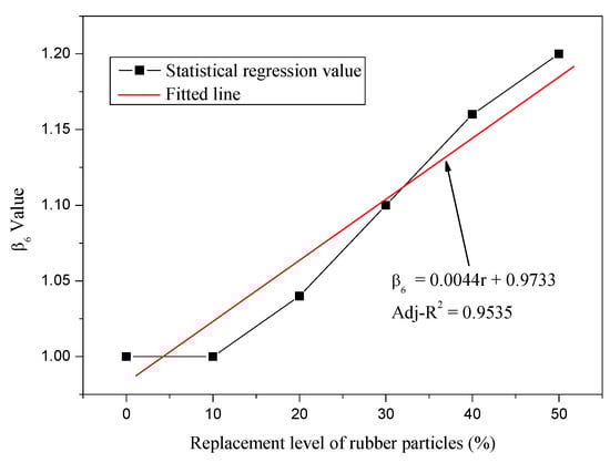 The relationship between β6 and rubber particles substitution percentage r was established as shown in Figure 7. It could be observed that the relationship between β6 and r was approximately linear with correlation coefficient of 0.9535, and the regression equation could be expressed as follows: