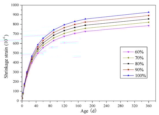 Based on the relationship between β6 and r described by Equation (38), the mean shrinkage strains of SCRLC with rubber particles substitution percentage estimates varied from 60% to 100%; these are presented in Figure 8. When the rubber particles substitution percentage increased from 60% to 100%, the shrinkage strains of SCRLC increased for each batch at a different age. According to GB/T 50082-2009 [33], the shrinkage strain of concrete at age of 360 days was deemed as final shrinkage. For SCRLC, with rubber particles substitution percentage increased from 0% to 100%, the final shrinkage strain increased from 624 × 10−6 to 894 × 10−6 with an increment of 48.4%. Nevertheless, the limiting value of shrinkage strain for LC was 820 × 10−6, which was stipulated in JGJ51-2002. When the rubber particles substitution percentage was 80%, the shrinkage strain of SCRLC was 834 × 10−6, which exceeded the limiting value. This meant that more than 80% of rubber particles substitution percentage in SCRLC would seriously affect the durability of SCRLC and should be given more attention in application of actual engineering.