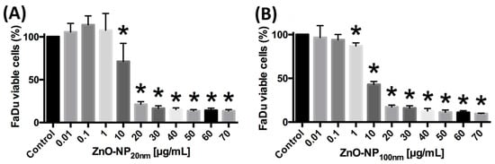 FaDu viability assessed by MTT assay in dependence of (A) ZnO-NP20 nm and (B) ZnO-NP100 nm (zinc oxide nanoparticle) solutions of various concentrations. The figure shows the results of three independent experiments. Significant differences arising from comparison with the untreated control cells are marked with *.
