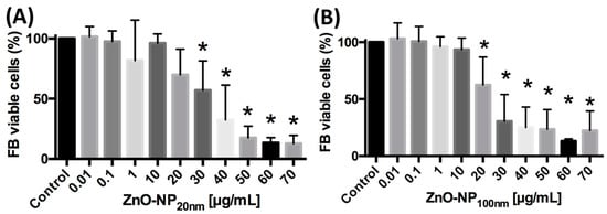 Cytotoxicity with respect to a significant reduction of FB viability was observed after exposure to ZnO-NP20 nm at concentrations of 30 µg/mL and higher (Figure 2). The vitality of the FB after incubation with ZnO-NP100 nm at concentrations of 20 µg/mL and higher was significantly decreased (Figure 2). The IC50 values were 30.4 µg/mL for ZnO-NP20 nm and 24.6 µg/mL for ZnO-NP100 nm in FB.