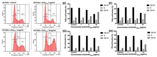 Cell cycle distribution of FaDu and FB in ZnO-NP20 nm and ZnO-NP100 nm solutions of various concentrations measured by propidium iodide flow cytometry. (A–D) show one exemplary analysis after incubation of FaDu cells with different concentrations of ZnO-NP20 nm. Due to exposure to 10 µg/mL ZnO-NP, the cell cycle distribution shifted to a higher fraction of the G2/M-phases in (E) + (F) FaDu and (G) + (H) FB.