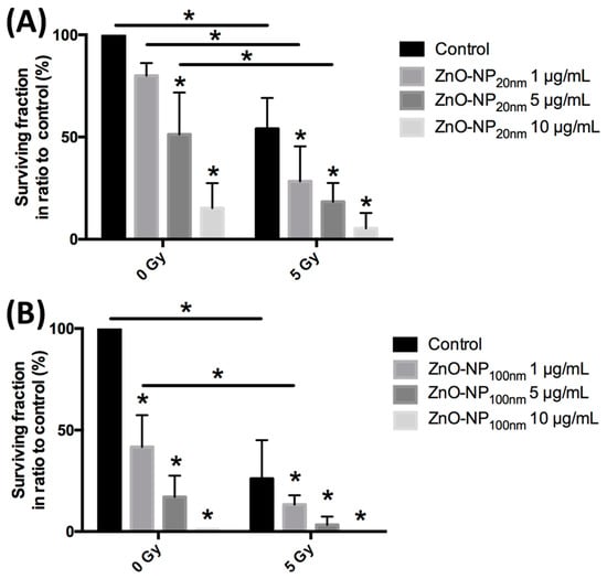 Clonogenic survival of FaDu after exposure to 0 Gy or 5 Gy irradiation and to (A) ZnO-NP20 nm and (B) ZnO-NP100 nm. All statistically significant differences in comparison to the control within the 0 Gy and 5 Gy groups are marked with an * over the column. Furthermore, all statistically significant differences after treatment with the same concentration of ZnO-NP are marked with an * on the girder. The data represent the mean ± standard deviation from three independent experiments.