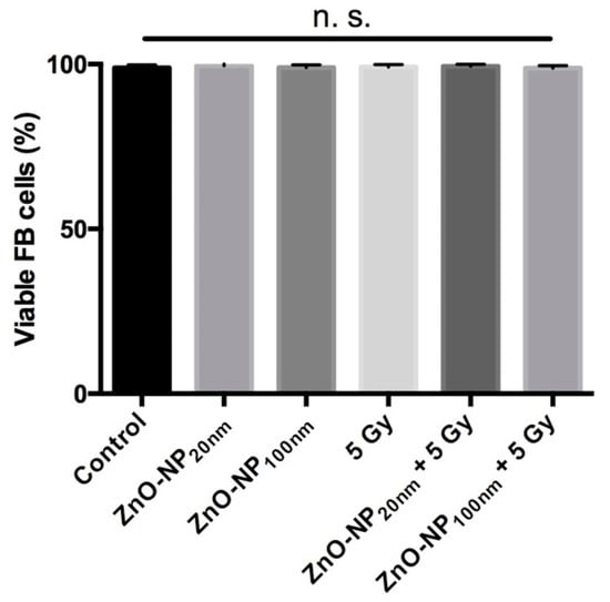 Viability of FB cells after treatment with ZnO-NP and/or radiation. There is no significant reduction of cell viability revealed by the trypan blue test.