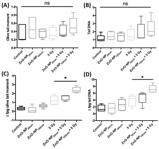 DNA damage and oxidative stress after FB exposure to ZnO-NP 1 µg/mL and ±5 Gy irradiation evaluated by conventional comet assay (A,B) and after addition of the formamidopyrimidine-DNA glycosylase (FPG)-enzyme (C,D). There is no significant difference in DNA damage measured by (A) OTM and (B) percentage of tail DNA in the conventional comet assay. As compared to the irradiated cells without incubation with ZnO-NP, those exposed to ZnO-NP100 nm show greater oxidative stress, as seen in (C) Δ fpg OTM and (D) Δ fpg tail DNA. The data represents experiments with five individual FB cells.