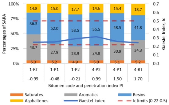 The results of bitumen fractional composition (SARA) were used to determine the colloidal instability (Gaestel) index Ic, which defines the overall colloidal system of bitumen. In contrast, the penetration index (PI) is a measure for the bitumen temperature sensitivity, where an increase of PI is associated with a decrease of temperature sensitivity [41]. The mean value of five to 10 rod readings of bitumen fractional groups (SARA) composition are presented in Table 2 and Figure 1. The results showed that the investigated different age bitumen binders are colloidally stable (sol–gel type); to be specific, Ic < 0.22–0.5 < Ic. However, all the recovered binders showed higher instability indexes than the corresponding other bitumen samples. This effect can be not only due to aging but also due to the bitumen recovery procedure. It was determined that the recovered binder did not have the same aging period as the PAV I or PAV II bituminous binders.