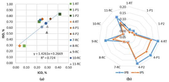 The FTIR-ATR test results for the composition of the bitumen functional groups were used to determine the oxidative aging structures (carbonyl ICO and sulfoxide ISO indexes) as well as determine the type of bitumen (neat or modified). A summary of the bitumen functional groups results is presented in Table 3, which shows the mean values of two to four replicates. The differences between the carbonyl and sulfoxide indexes are presented in Figure 2a. The results show that ICO increases all the time with aging, but ISO mainly increases after the first PAV; then, it stabilizes and changes slightly. The ICO increased by 2.8 times after PAV I (1-P1) and 5.2 times after PAV II (1-P2) for neat bitumen, and by 6.8 times after PAV I (4-P1) and 8.9 times after PAV II (4-P2) for modified bitumen. The ISO increased also by 2.4 times after PAV I (1-P1) and 2.8 times after PAV II (1-P2) for neat bitumen, and by 2.6 times after PAV I (4-P1) and 2.6 times after PAV II (4-P2) for modified bitumen. However, polymer-modified bitumen after the same double long-term aging PAV II (44 h) showed a lower content of carbonyl and sulfoxide indexes, which indicates that modified bitumen aging less. The correlation between SO and CO indexes (Figure 2a) showed that unknown naturally aged bitumen had similar values to bitumen after 22 h PAV (P1). Therefore, for further research, in order to evaluate the effect of long-term aging in Lithuania climatic conditions, we can assume 24 h of PAV, which will represent around 15 years of pavement service life.