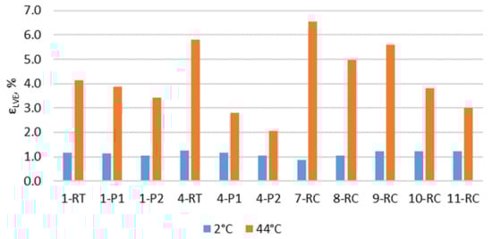 To determine the master curves and to use the time–temperature superposition principles, the LVE region was determined. The strain of LVE range (εLVE) determined at 95% decreased the initial G* value during the strain sweep test (with 8-mm geometry) and is presented in Figure 3. The strain at 2 °C was around 1.13% to all bitumen binders; however, the biggest difference was determined at 44 °C. The test results show that with increasing aging steps the εLVE decreases; however, this was an expectation for the recovered binder.