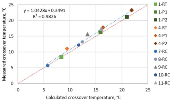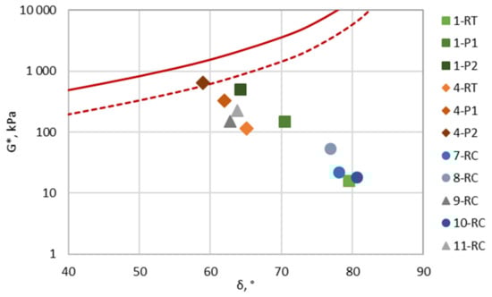 The crossover point (described as temperature or frequency) represents the balance between the storage (G′) and loss (G″) modulus, which means the transition point of colloidal stability; then, the gel–sol turns to sol–gel behaviour. For analysis, the crossover temperature was selected considering the fact that at temperatures above Tδ = 45°, bitumen behaviour dominates in sol–gel. It is expected that flow stress and rutting damage appear, while below Tδ = 45°, tension strain and cracking appear [51]. According to some authors [51], the crossover temperature (Tδ = 45°) shifts with bitumen age as a result of the increased amount of larger molecular weight functional groups. Importantly, Tδ = 45° can be determined calculating it from a master curve at a 45 °C phase angle and 10 rad/s, or it can be obtained directly from the temperature sweep experimental results. Next, we consider that the Tδ = 45° can be also used to validate the master curve function fitting [51]. The correlation of measured crossover temperatures by a temperature–frequency sweep test and calculations from a master curve is presented in Figure 4. From Figure 4, the Tδ = 45° increases with aging can be seen: neat bitumen (1-RT) Tδ = 45° increased by 7.9 °C after PAV I (1-P1) and 12.8 °C after PAV II (1-P2), while polymer-modified bitumen (4-RT) increased by 6.7 °C after PAV I (4-P1) and 12.2 °C after PAV II (4-P2). The bitumen 7-RC, 8-RC, and 10 RC show lower Tδ = 45° than expected comparing to their life in service, which may be due to a properly performed recovery procedure and the remaining extracted solvent. The correlation between measure and calculated Tδ = 45° is very good, but slightly up from the control line.