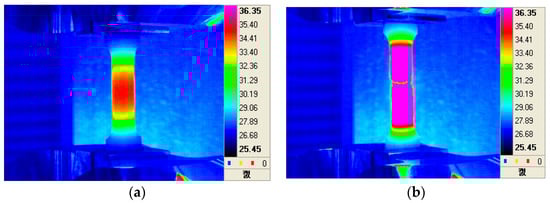 In Figure 1a,b, it can be seen that there were no significant differences in the surface temperature of the two tensile specimens at break. This result means that the final breakdown occurred very smoothly without any signs before final failure as shown in Figure 2. As shown in Figure 3, the final fracture shows an abrupt peak of temperature rise at break and occurs instantaneously. This means that the temperature rise peak at break was observed due to the specimen failure at the final failure of the specimen. These results indicate that IR thermal imaging can be a useful tool for analyzing the tensile failure behavior of railway axle materials.