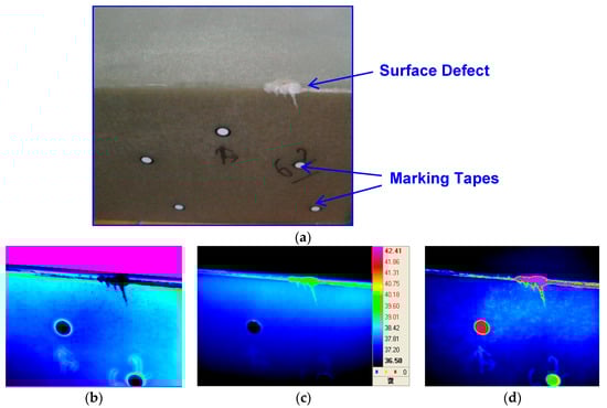 Figure 11 shows the results of lock-in thermography and evaluation for railway bogies using E-glass fiber-reinforced epoxy polymer matrix composites. The conditions for performing lock-in thermography were as follows. Two halogen lamps (500 W) were applied as an external heat source, and the experiment was conducted by periodically applying heat to the specimen surface using a function generator. The excitation frequency used was in the range 0.1–0.01 Hz, and the optimum frequency was found. After applying the halogen heat source periodically, the surface defects of the PMC bogie were successfully displayed in phase, temperature, and amplitude as shown in Figure 11.
