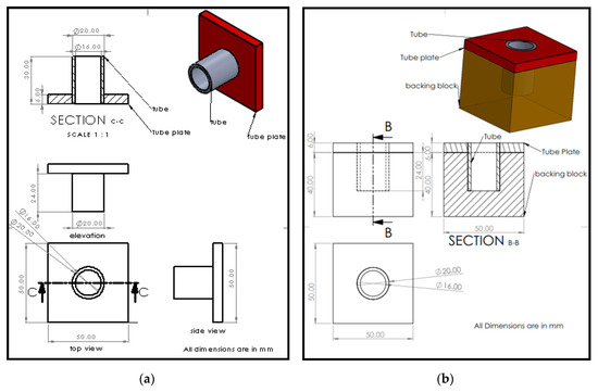 (a) Diagram of the tube to tube plate setup arrangement; (b) diagram of the backing block (supporting block).