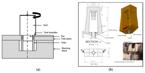 The exterior tool is made up of tool-pin and shoulder [9]. It is assembled in a modified milling machine tool holder arrangement. Figure 1a,b depict the diagram of the tube to tube plate arrangement and backing block along with dimensions.