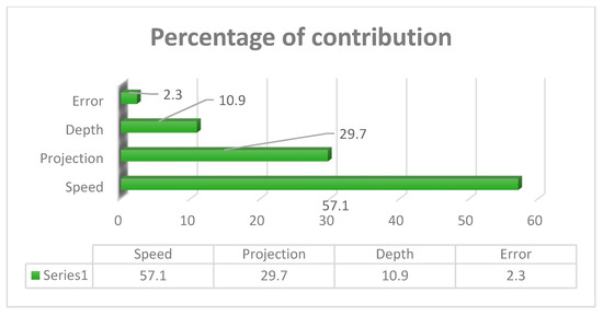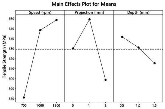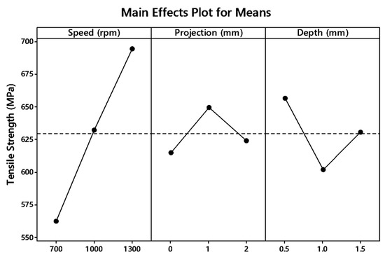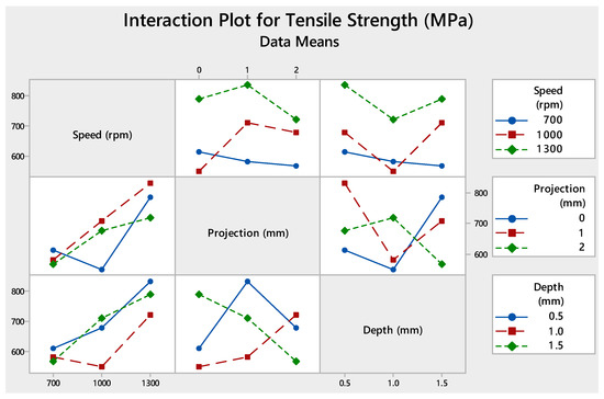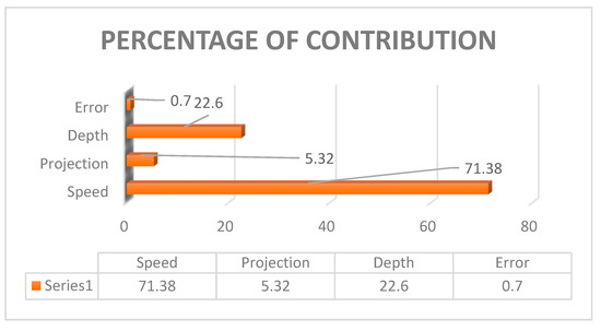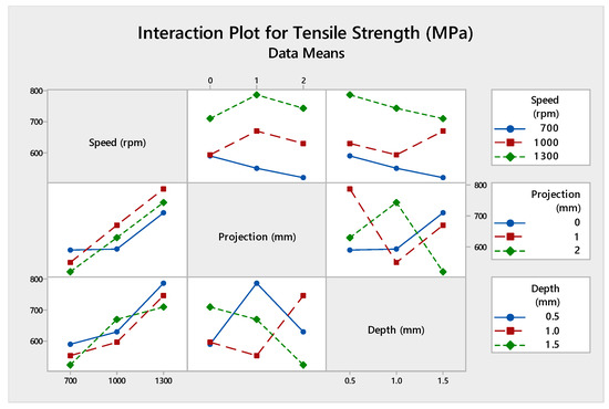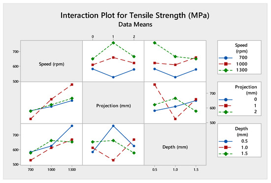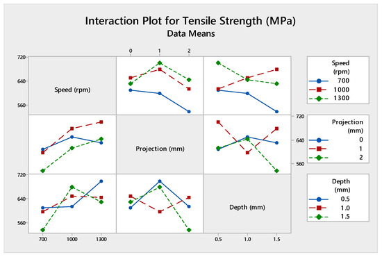 Analysis of variance was being performed to find out the contribution of each parameter by using the software MINITAB (MINITAB 18, Pennsylvania, USA). Table 8 shows the percentage contribution of process parameters. Moreover, Figure 6 and Figure 7 show the interaction plot and graphical representation of process percentage. As per the result, the maximum contribution among the input parameters was tool rotational speed (73.08%) followed by the depth of cut (16.80%) and tube projection (7.57%).