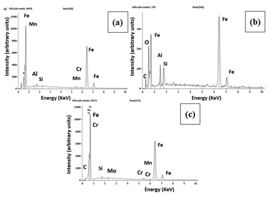 Scanning electron microscope with EDS at (a) 700 rpm, (b) 1000 rpm, (c) 1300 rpm