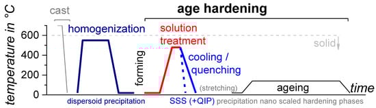 As seen from the above—and which is true for every engineering material—the structure of the material at micro- and nanoscales affects its properties. Thus, for several metallic alloys, changes in the inner structure due to solid-solid phase transformations control the properties. This includes not only mechanical properties such as strength, ductility and toughness, but also corrosion properties and others. The precipitation of secondary phase particles from a solid solution represents a solid-solid phase transformation. In technological applications, solid-solid phase transformations are typically adjusted by controlled heat treatments. Figure 1 shows a schematic diagram of the time-temperature profiles of some heat treatments that are relevant to the production of Al alloys. In addition to heat treatments, the production may incorporate several forming operations such as rolling or extrusion (at ambient or elevated temperatures), which substantially influence the microstructure. In addition, rolled or extruded products with relatively simple cross sections may experience a stretching treatment subsequent to the quenching process within the age-hardening treatment (prior ageing). This stretching causes relief of residual stresses induced by quenching, straightens the products and increases the dislocation density and thereby the nucleation site density for nanoscale precipitation during the final ageing.