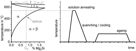 For Al alloys, the most relevant heat treatment that influences strength is age-hardening [5]. To allow age-hardening in the first instance, alloying element atoms need to be added to the Al base material. This is mostly done in the liquid phase during casting. Age-hardening makes use of the decreasing solubility of aluminium with respect to the major alloying elements and decreasing temperature (see Figure 2). The heat treatment process of age-hardening consists of three major steps: solution treatment, quenching and ageing. The solution treatment aims to achieve a solid solution. A certain duration of soaking at solution temperature is often used to finalise the dissolution processes and/or to obtain a homogeneous distribution of the dissolved alloying element atoms within the matrix. The amount of dissolved major alloying elements typically substantially exceeds the solubility at room temperature. However, during cooling or quenching, the alloying elements need to be kept in solid solution, resulting in supersaturation of the base material. This condition is far from the thermodynamic equilibrium and is thus unstable (this is often referred to as meta-stable since the stability is relative within the timescales considered). From this unstable supersaturated solid-solution during the final ageing treatment, a high particle number density of nano-scale precipitates grows, which hinder the dislocation movement and thereby increase the strength.