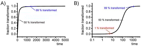 Example of a model for diffusion-controlled precipitation reactions [82]: (A) plotted on a linear time scale; (B) plotted on a logarithmic time scale.