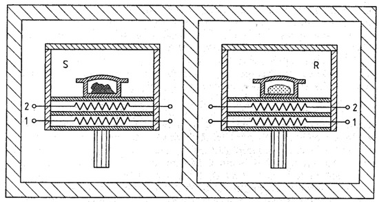 Construction scheme of a power-compensated scanning calorimeter (PerkinElmer Instruments). S: Sample furnace with sample in crucible; R: reference-furnace (analogous to sample-furnace); 1: heating wire; 2 resistance thermometer. Both sensors are separated from each other and located in surroundings at constant temperature (cold block) [113].