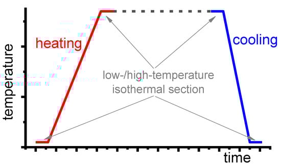 In this work, each temperature-time profile of a DSC measurement starts and ends with an isothermal section (see Figure 5). This is needed for heat capacity calculation employing two or three curve methods (for details see [112]).