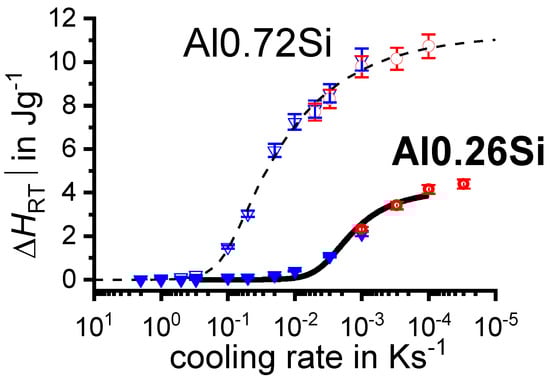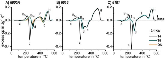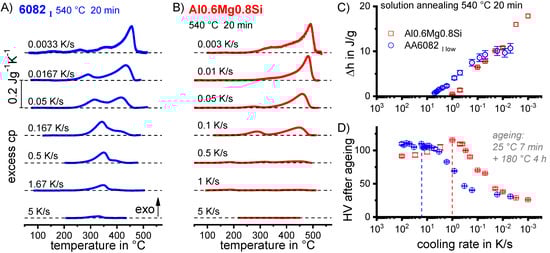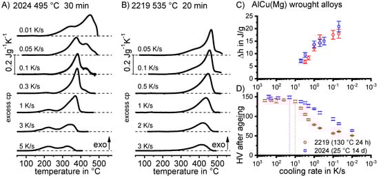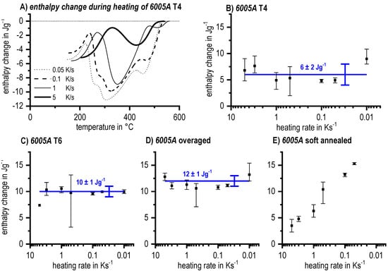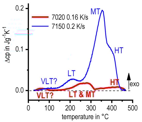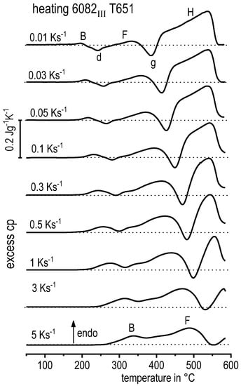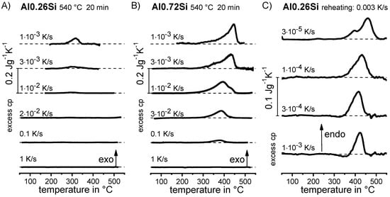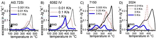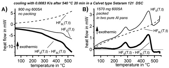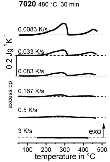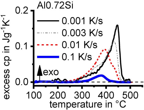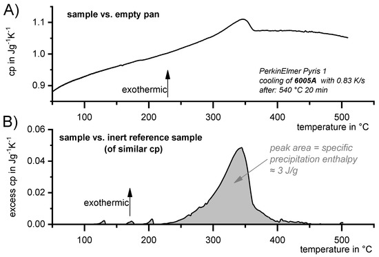 The specific excess heat capacity is obtained here by measuring an alloyed sample versus a reference sample with similar heat capacity. The specific excess heat capacity is then defined to be the difference between the specific heat capacity of the alloyed sample and that of an inert reference sample. In an ideal situation, the reference and the alloy sample have highly similar absolute heat capacities over the entire temperature range of interest. Another requirement for the reference sample is that it must be inert with respect to thermal reactions within the temperature range of interest. It may be difficult to find appropriate reference material, but in the case of Al alloys, pure Al has proven to be very well suited [120,121]. Pure Al reference samples are preferably used in a pre-oxidised condition, i.e., heated once before the actual measurement; however, there are various strategies for obtaining a suitable reference sample [122], and changes in the sample mass to adjust the total heat capacities of the sample and reference sample may further improve the signal quality [122,123].