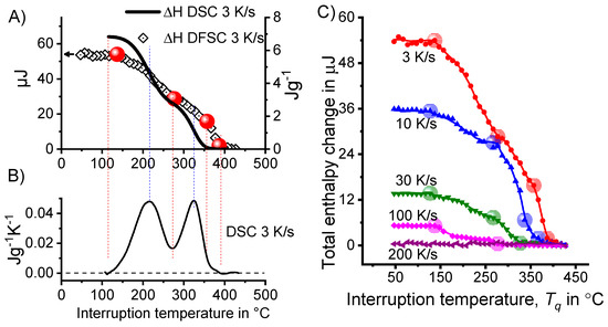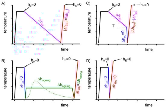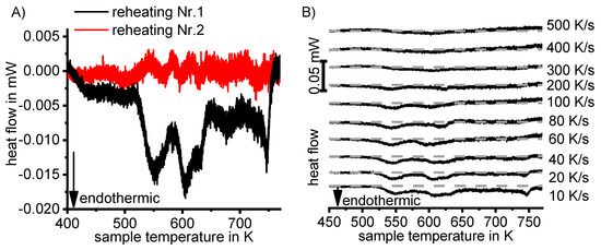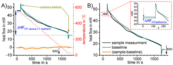 In terms of the intended evaluation of solid-solid phase transitions, the zero level of the considered DSC measurement is of outstanding importance, particularly when the enthalpy changes are to be determined quantitatively. The measured signal of excess cp can still be curved, and may particularly deviate from zero in temperature regions in which no reactions are occurring (the excess cp should be zero here). This zero-level curvature can have multiple reasons. To ensure a reliable and straight signal close to zero level, only adequately calibrated calorimeters should be used (for calibration details, see [113,124]). It is also reasonable to check each DSC run and its corresponding baseline measurement using the following quality attributes: (i) the heat flow difference between the high- and low-temperature isothermal section (Figure 7A); and (ii) the heat flow difference between the heat flow values of the sample and baseline measurements of the high-temperature isothermal section (Figure 7B). The acceptable values of the heat flow difference depend on both the specific device and their continuity with time; for instance, the heat flow difference between the isothermal sections at high and low temperatures depends mostly on the symmetry and adjustment of the device. More important than the absolute values of these differences is the reproducibility. An unfavourable value may be acceptable as long as it is constant with time [83], but for highest accuracy, the values of heat flow differences should be small, i.e., in case (i) within the range of few tenths of mW, and in case (ii) within the range of a few mW for the PerkinElmer power-compensated differential scanning calorimeter.