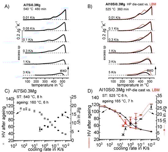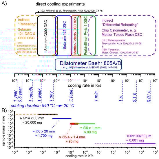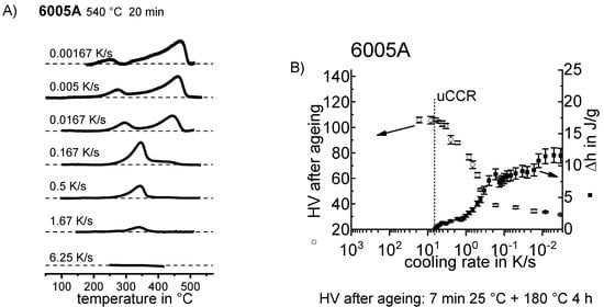 All of the mentioned heat treatment steps make use of or are directly related to diffusion-controlled solid-solid phase transformations. In particular, in the heating and cooling steps of the heat treatment, solid-solid phase transformations take place under continuously changing temperatures. In practical applications, these dynamic changes in temperature generally depend on the quenching media used and the dimensions of the components and/or the batch (see for instance Fig. 3.64 in Ref. [81], page 613). Since diffusion is strongly dependent on temperature and time, a wide range of relevant heating and cooling rates needs to be assessed. This means that diffusion-controlled processes like precipitation in Al alloys need to be considered on logarithmic time scales. This can be derived from a theoretical description of diffusion, for instance, and is illustrated by an example in Figure 3. Diffusion-controlled precipitation reactions can be described by a Starink-model based on the extended volume αext concept [82]. Figure 3 for an isothermal precipitation plots the fraction transformed as a function of time, on a linear time scale (Figure 3A) and on a logarithmic time scale (Figure 3B). It can be seen from Figure 3 that only by using a logarithmic time scale can we analyse this diffusion process in its entirety. Thus, cooling DSC analysis on quench induced precipitation should also cover a cooling rate range spanning several orders of magnitude, and the results should be displayed on logarithmic time scales.
