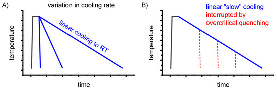 In order to obtain a comprehensive understanding of the quench sensitivity of age-hardening alloys, the kinetics and nature of quench-induced precipitation must be analysed. Since there were limited options for in situ analysis prior to the major work reviewed here, most of the earlier experimental work was based on ex situ experiments. In 2010 Shuey and Tiryakioglu published a reviewing chapter on “quenching of aluminium alloys” including experimental results on a broad range of alloys as well as theoretical options for their evaluation [44]. Different quenching paths have therefore been frequently used for samples, for instance by using different quenching media [45,46,47,48,49] or by applying Jominy end-quench tests [50,51,52,53]. Subsequent post-quench analysis of certain properties has led to the assessment of the quench sensitivity. Besides continuous cooling, quenching to various isothermal soaking temperatures has also been frequently applied, again in combination with a subsequent property analysis, which allows isothermal time-temperature property diagrams to be derived, for instance [10,18,23,54]. In order to allow evaluation of continuous cooling basing on isothermal experiments, the quench factor analysis method was developed [20] and refined [47,48,52,55,56,57,58].