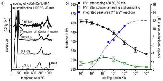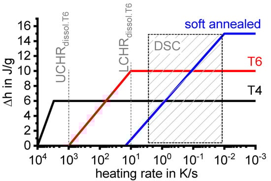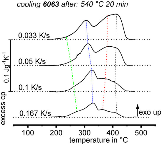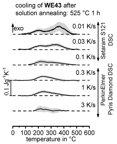 However, DSC also has certain disadvantages and limitations. In particular, DSC detects the heat effects of all occurring reactions in sum. Since different reactions occur simultaneously in several cases, it can be hard to distinguish the different parts of the signal that belong to specific reactions. This makes the interpretation of DSC heating experiments particularly complicated, as opposite heat effects from endothermic dissolution and exothermic precipitation can occur during heating [120]. Since only precipitation will take place during cooling, DSC still is the most promising method for comprehensive analysis of the kinetic behaviour of quench-induced precipitation.