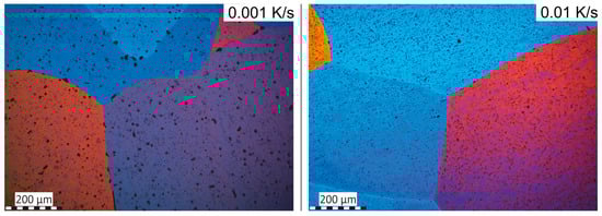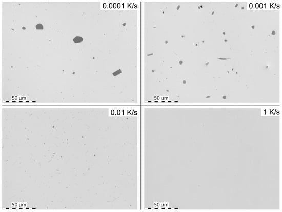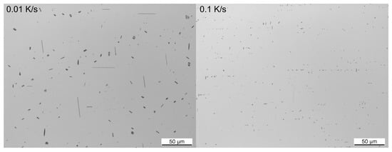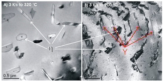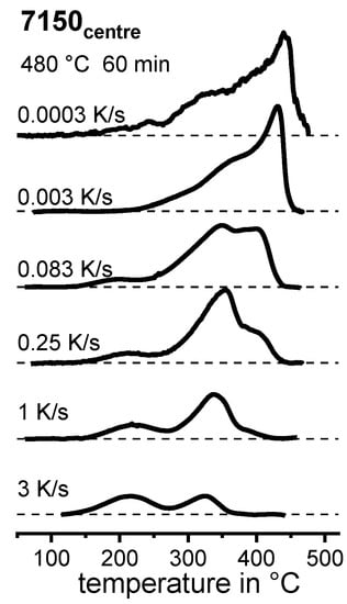 Similar problems occur in the dilatometric measurement of quench-induced precipitation. Modern dilatometers have a very high resolution for length changes, which even allow the detection of early cluster formation in age-hardening Al alloys [64,65,92]. It has been shown that dilatometry is also able to detect quench-induced precipitation in Al alloys over a wide range of cooling rates [93,94]. Nevertheless, the changes in the volume of a sample during cluster formation and precipitation are affected by the complex interplay between the volume changes in the matrix crystals and the volume changes due to the precipitated phase. That is, in some cases, precipitation can cause volumetric expansion of the sample, while precipitation of another phase can cause volumetric contraction [64,84,94]. The latter aspect complicates the evaluation of dilatometric measurements of quench-induced precipitation, as different phases that precipitate during cooling can cause opposite changes in length.