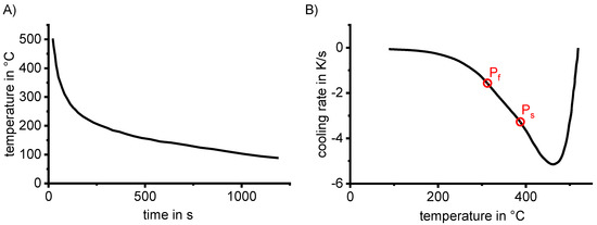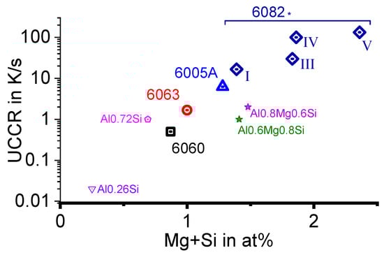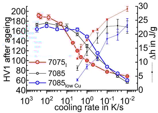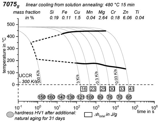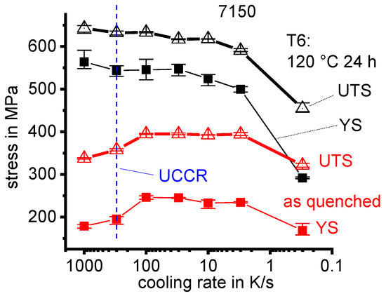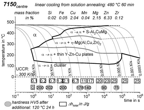 The quench sensitivity of Al alloys has been researched for about 70 years (e.g., [10,11,12,13,14,15,16,17,18,19,20,21,22,23,24,25,26,27,28,29,30]). Within the existing substantial body of work, the definitions of the term “quench sensitivity” differ, and this term generally refers to a reduction in the final properties (e.g., strength; ductility/toughness; corrosion-resistance) in the as-quenched state [21] or after ageing, generally as a result of reduced cooling rates [15,19,27]. The reason for this reduction, for instance in the hardness or yield strength, is the coarse precipitates which grow during cooling [25,31,32]. Although these coarse quench induced precipitates have very little hardening effect in themselves [33], the atomic fraction of alloying elements that is bound in quench-induced precipitates reduces the amount of solutes available for the formation of strengthening precipitates during ageing. The degree of solute reduction obviously depends on the fraction of quench-induced precipitates that is formed. Another aspect relating to quench sensitivity is the loss of properties across the thickness of a thicker product, which is related to a reduced cooling rate in the core of the material [34,35]. However, the definition of quench sensitivity is refined here, and the tendency of an age-hardening alloy to “lose” solute atoms to coarse (some 100 nm to µm sized), undesired quench-induced precipitates is called quench sensitivity. As will be demonstrated below, the quench sensitivity can be characterised by two major attributes: firstly by the minimum cooling rate, which is required to obtain a fully supersaturated solid solution (which after ageing can produce the highest strength), i.e., the so-called upper critical cooling rate (UCCR), and secondly by the slope of property loss as a function of the reducing cooling rate.