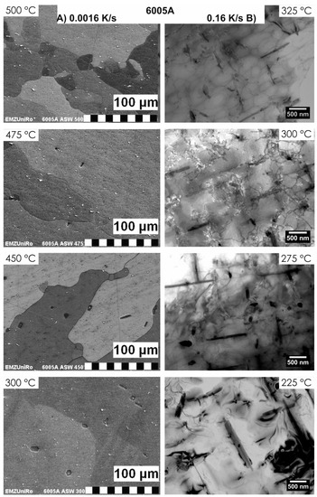 - Saito, T.; Marioara, C.D.; Røyset, J.; Marthinsen, K.; Holmestad, R. The effects of quench rate and pre-deformation on precipitation hardening in Al–Mg–Si alloys with different Cu amounts. Mater. Sci. Eng. A 2014, 609, 72–79. [Google Scholar] [CrossRef]