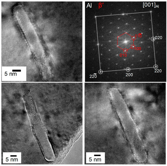 - Cayron, C.; Buffat, P.A. Transmission electron microscopy study of the beta’ phase (Al-Mg-Si alloys) and QC phase (Al-Cu-Mg-Si alloys): Ordering mechanism and crystallographic structure. Acta Mater. 2000, 48, 2639–2653. [Google Scholar] [CrossRef]