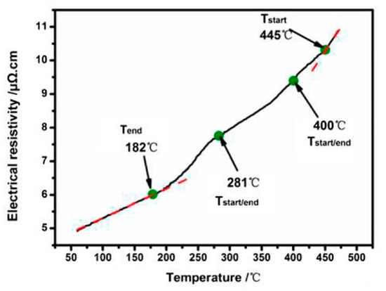 Hong-Ying Li et al. demonstrated that continuous measurements of the electrical resistivity can be applied for the determination of continuous cooling transformation or precipitation diagrams [59,60,85,86,87]. However, it appears that the problem of control over the sample temperature has still not been fully solved, as this group applied several different approaches to achieve continuous cooling, including a self-made temperature control system [59]. They also later quenched samples in different media [60,88], and thereby achieved a considerable range of cooling rates. To the best knowledge of the authors, no commercial device is currently available that allows for the continuous measurement of electrical properties over a wide range of temperatures whilst achieving controlled cooling. In addition, the electrical conductivity is affected by several factors, making interpretations of precipitation difficult. For example, alloying elements in solution reduces the electrical conductivity [89], and precipitates may also have a negative influence on the conductivity [90]. The latter is generally lower compared to elements in solution, although the exact value depends on the size and strain field caused by the precipitates [90,91]. Furthermore, the different alloying elements in solid solution impact the electrical properties by substantially different factors [89]. For these reasons, the measured changes in the electrical resistance or conductivity are not directly related to precipitation or the volume fraction of precipitates, and potential changes in the superimposed influencing factors cannot be directly assigned to precipitation.