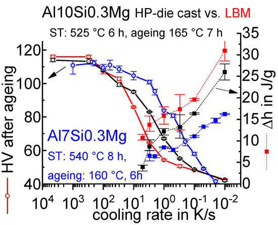 - Schumacher, P.; Reich, M.; Mohles, V.; Pogatscher, S.; Uggowitzer, P.J.; Milkereit, B. Correlation between supersaturation of solID solution and mechanical behaviour of two binary Al-Si-alloys. Mater. Sci. Forum 2014, 794–796, 508–514. [Google Scholar] [CrossRef]