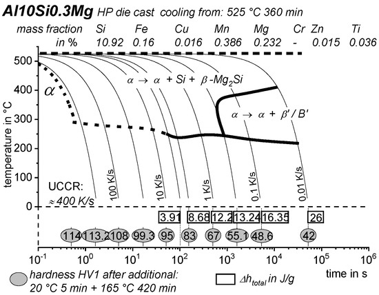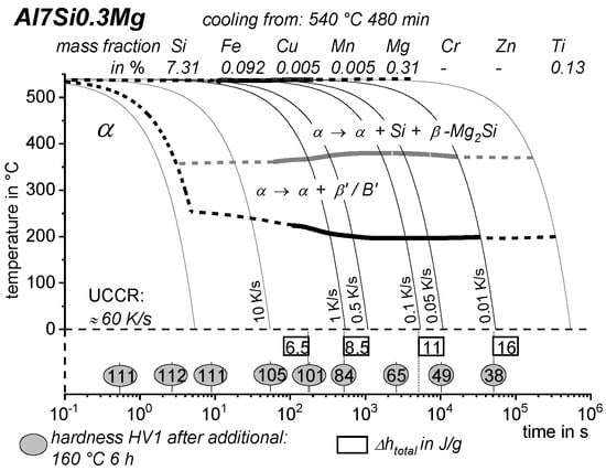 - Milkereit, B.; Fröck, H.; Schick, C.; Kessler, O. Continuous cooling precipitation diagram of cast aluminium alloy Al-7Si-0.3Mg. Trans. Nonferrous Met. Soc. China 2014, 24, 2025–2033. [Google Scholar] [CrossRef]