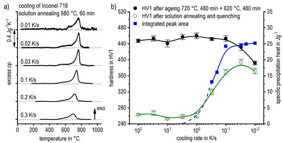 Since precipitation is an exothermic process, and dissolution an endothermic one, they can be detected by thermal analysis. Cavazos and Colas used direct thermal analysis of Jominy-like end-quench samples, i.e., they evaluated the changes in slope of the measured temperature development at different positions in the sample [25]. A more precise analysis of the thermal effects of solid-solid phase transformations is possible using calorimetry. DSC, in particular, allows for the detection of quench-induced precipitation in age-hardening metals [31,78,79,80]. Amongst the potential methods for the in situ detection of quench-induced precipitation in aluminium alloys, DSC is the most effective approach, as it has significant advantages. These in brief are: