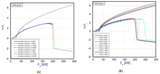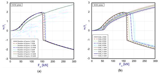 In this subsection, the results concern an assessment of the plate behavior in the post-buckling state with reference to different parameters. Figure 4a,b depict a deflection in the center of the plate vs. the static compression load for the SSSS plate (in the first stage, one half-wave was noticed). The curves are plotted for both the methods under consideration. Figure 4a presents an influence of the layer number on the plate stability (from five to 15 layers with a step-variable gradation of material properties according to Figure 2). In the case of a change in the number of layers, any significant difference cannot be seen in the obtained curves. It seems that the overall bending stiffness for the considered cases provides the same effect. In a comparison of the results based on the two methods, a major discrepancy can be noticed. First of all, the FEM results provide a considerable deflection of the plate before the first critical force is reached. In contrast, in the SAM, a deflection appears just in the vicinity only and grows very fast (compared to the FEM curves). Moreover, in the SAM results, a change in the buckling mode was not observed after applying a higher load, which takes place in the FEM analysis in contrast. Furthermore, deflections in the SAM are greater than deflections in the FEM. The same response of the plate was seen for different variants (Figure 4b) by increasing the thickness of alumina and decreasing the thickness of the FGM. Nevertheless, the trends of curves seem to be very logical because with an increase in ceramics, the deflections of the plate slightly drop—this is due to higher resistance. Apart from these aspects, a jump in the buckling mode occurs on the diagrams at higher loads. Minor differences between the results of the two methods were observed for the SCSC plate (clamped unloaded edges—Figure 5a,b) but the plate analyzed with the FEM deflected faster than in the SAM.