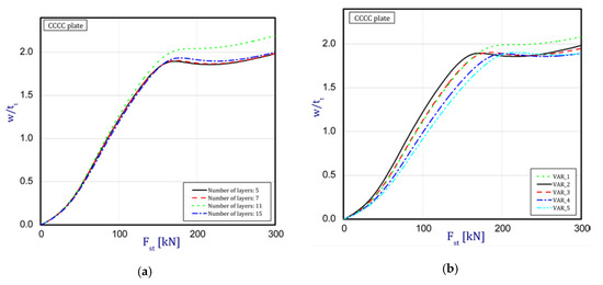 Static load vs. the normalized deflection (FEM) in the middle of the plate for the plate CCCC: (a) a different number of layers (b) different variants.