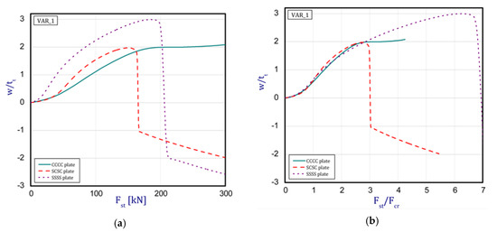 where: is the critical stress of the r-th buckling mode, is the dimensionless amplitude of the r-th buckling mode, is the dimensionless amplitude of the initial imperfections related to the r-th buckling mode, is the compressive stress, and and are the coefficients, respectively. The range of indices are , , is from 1 to , where is the number of interacting modes. The summation was determined based on the repeated indices. For the case of the uncoupled buckling mode (i.e., for the one-mode approach), has to be satisfied. The first order coefficients (i.e., ) were found with the analytical-numerical method based on Koiter’s theory [15–18,27] etc. The second order coefficients (i.e., ) were calculated with the semi-analytical method (SAM) [16,17]. When using that method, it was necessary to determine approximate values of on the basis of the linear buckling problem. The co-author of SAM is also the co-author of this article. In the present work, a SAM one-modal approach has been applied ( in Equation (1)). This means one degree of freedom in nonlinear analysis was taken into account. The imperfection of the plate was assumed as in the numerical model: . The finite element method allows us to simulate a complex numerical model but boundary conditions and element types also play a major role. In comparison to the SAM included in the present paper, a single calculation based on FEM requires between one hour and a couple of days to compute. Using the semi-analytical method, one can obtain the results within 5–15 min, which can provide a major benefit. Moreover, differences in results between two methods amount to a few percent (referring to critical forces) or to several dozen percent (compared to the post-buckling paths), at most.
