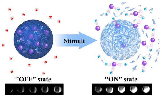 A schematic representing the impact of a generic stimulus on nanoparticle generated magnetic resonance imaging (MRI) contrast. The stimulus may be pH, enzyme activity, or temperature in nature, or may reflect the prescence of specific proteins/enzymes. In this example T1 contrast capabilities are switched “on”/“off” with a particular biological stimulus. The MR active moieties (purple spheres) are encapsulated within a responsive matrix and released into solution in the prescence of this particular stimulus (enhancing MR contrast by interacting with local water proton; red = non-enhanced relaxation, blue = enhanced relaxation). Adapted with permission from the authors of [13]. Copyright (2013) American Chemical Society.
