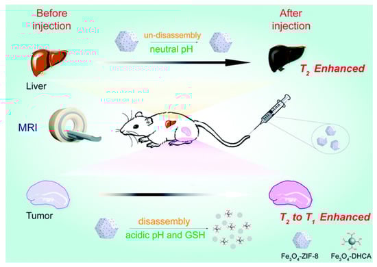 - Lin, J.; Xin, P.; An, L.; Xu, Y.; Tao, C.; Tian, Q.; Zhou, Z.; Hu, B.; Yang, S. Fe3O4–ZIF-8 assemblies as pH and glutathione responsive T2–T1 switching magnetic resonance imaging contrast agent for sensitive tumor imaging in vivo. Chem. Commun. 2019, 55, 478–481. [Google Scholar] [CrossRef]