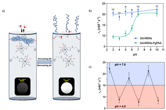 The functionalisation of MSNs with polymers containing ionisable groups introduces a generic pH-responsivity that has been utilised in gatekeeper switching based drug release. Polymers such as poly(vinyl pyridine) (PVP), chitosan, poly(acrylic acid) (PAA), and poly(L-histidine) (PLH) have all been applied on MSNs for this purpose [7,8,9,10]. Recently, Gd-chelates have been incorporated into MSNs capped with the pH-responsive polymer PAA to produce a pH-responsive nanoparticulate T1 contrast agent (Figure 3) [40]. The pH-responsivity here arises from the protonation state of the monomer unit and associated polymer conformational change from a hydrophobic, collapsed conformation to a hydrophilic, extended conformation as it charges. With the polymer in its extended state, the improved water access through the pore channels leads to a reversible 130% increase in r1 values (Figure 3c). This work constitutes the first reported example of a fully reversible pH-responsive nanoparticulate T1 contrast agent.