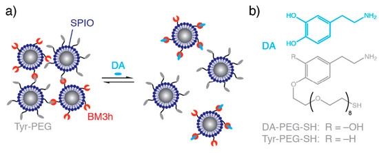 Dopamine sensitive IONPs. (a) The effect of dopamine on particle aggregation. In the absence of dopamine, nanocluster assemblies form owing to binding between protein (BM3h) and a dopamine analogue (Tyr-PEG). On addition of dopamine (DA), competitive binding inhibits self-assembly. (b) The structures of dopamine and tethered dopamine analogue. Reprinted (adapted) with permission from the authors of [11]. Copyright (2019) American Chemical Society.