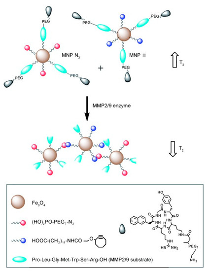A schematic representing the click coupling of IONPs functionalised with azide (red) groups and those functionalised with alkyne groups (blue). These particles expose azide/alkyne groups in the prescence of matrix metalloproteinase (MMP) enzymes, facilitating a click reaction mediated particle coupling. The effect on the T2 relaxation can be seen alongside both the individual IONPs (top) and the nanocluster (bottom). The particles also contain tumour specific peptide ligands and are functionalised with PEG to improve biocompatibility in vivo. Reprinted with permission from the authors of [52]. Copyright (2014), with permission from John Wiley and Sons.