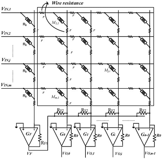 If wire resistance is not omitted, it can be modeled by small-value resistors along vertical and horizontal lines as shown in Figure 3. The ith column of crossbar is separated and shown in Figure 4. The output voltage of the ith column is calculated by applying Ohm’s law and the Kirchhoff’s current law to the node of V− of the Op-amp, as presented in Equation (3).
