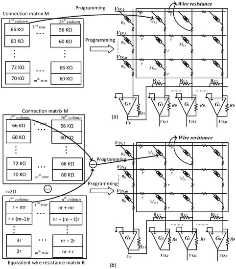 (a) The conventional programming scheme, in which the memristance values in connection matrix are used to program the corresponding cells in crossbar array and (b) the proposed parasitic resistance-adapted programming scheme, where the value of connection matrix is updated by subtracting the proposed equivalent wire resistance matrix from the original connection matrix. The updated connection matrix is then used to program the crossbar array. R is the proposed equivalent wire resistance matrix for an m × n crossbar array. r is the value of wire resistance, m is the number of rows, and n is the number of columns.