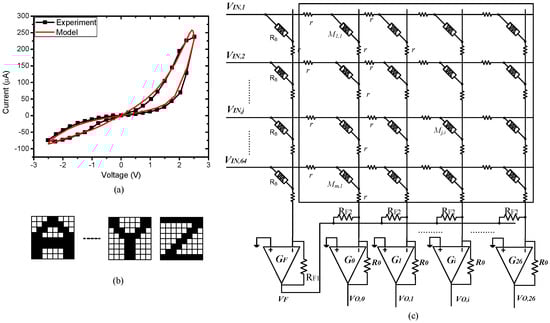 (a) The memristor’s current–voltage characteristic measured from the real device and the memristor’s behavior model; (b) the eight × eight images of characters used to test the proposed equivalent wire resistance modeling method and the parasitic resistance-adapted programming scheme; and (c) the schematic of crossbar circuit for the application of character recognition.