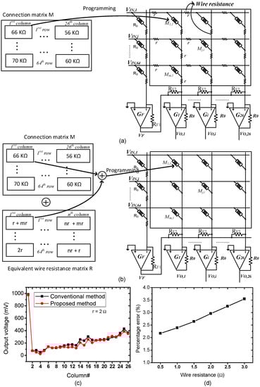 The proposed wire resistance modeling method using equivalent wire resistance matrix was verified by the simulation that was set up as presented in Figure 8a,b. The synaptic weights obtained from the training process were converted to the memristance values in connection matrix using Equations (2) and (6). For the conventional method, wire resistance was modeled by small-value resistors along vertical and horizontal lines, as shown in Figure 8a. The crossbar was programmed to the target memristance values presented in the connection matrix using the VDD/3 write scheme [32]. For the proposed method, we calculated the equivalent wire resistance matrix as shown in Figure 5. The small-values resistors were not present in the crossbar circuit, the value of equivalent wire resistance matrix was added to the connection matrix instead, as conceptually shown in Figure 8b. In other words, the connection matrix was updated by adding corresponding elements of the connection matrix and the proposed equivalent wire resistance matrix. The crossbar was then programmed to the target memristance values presented in the updated connection matrix using VDD/3 write scheme. In Figure 8c, the output voltages of 26 columns for recognizing 26 characters were measured when the vector of character “A” was applied to the inputs. Among the 26 columns, only the first column produced high voltage for recognizing character “A”. When wire resistance was set to be 2.0 Ω, the voltage drop on wire resistance made the output voltages of columns increase, as shown in Figure 8c [33]. Since the voltage drop on wire resistance depends on the length of metal line, the column close to the first column had less change of voltage whereas the column far from the first column had much change of voltage, as demonstrated in Figure 8c [33]. The result obtained from the conventional method is represented by the square symbols and that one obtained from the proposed method with equivalent wire resistance matrix is represented by the round symbols. The discrepancy between the two methods was as low as 3%.