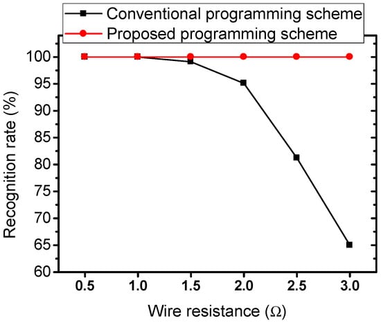 The comparison of recognition rate between the conventional programming scheme and the proposed parasitic resistance-adapted programming scheme when wire resistance is varied from 0.5 to 3.0 Ω.