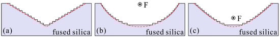 where Ip = I0 exp[−2(x − υt)2/ω02] f(t) is the incident laser intensity at position x and time frame t, I0 is the axial intensity of a Gaussian spot, v is the velocity of the spot, ω0 is the radius of the spot at 1/e2, f(t) represents the square wave with a pulse duration of τ and a pulse repetition of fr, R is the reflectivity at the wavelength (0.15 @ 10.6 µm), ρ is the density of fused silica (2201 kg/m3), and ΔH is the total change in enthalpy required to volatilize the material (11.4 MJ/kg) [10,16,17]. If the laser spot on the raw surface of a multi-stage structure is scanned, then the surface will gradually become continuous in the designed shape. The parameters that were used for the simulation are shown in Table 1. It should be mentioned that the diameter of the Gaussian spot was set to 120 µm@1/e2, which is equal to the value in the experimental system.
